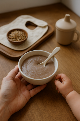 Most parents begin with ragi porridge for 6-month-old babies because it’s smooth and easy to swallow. Start thin → gradually go thicker as your baby learns to chew.